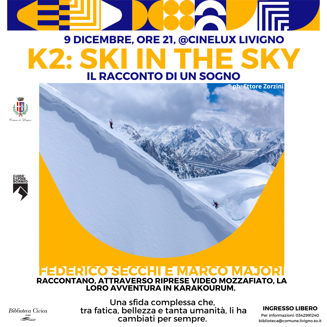 Lunedì 9 dicembre alle 21 presso il Cinelux si terrà l'incontro K2: SKI IN THE SKY, con le guide alpine Marco Majori e Federico Secchi, che lo scorso luglio hanno affrontato la seconda vetta più alta del mondo.