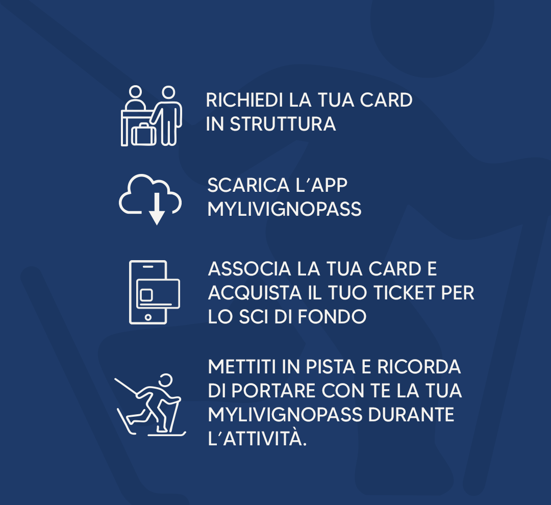 Se soggiorni a Livigno, richiedi la tua MyLivignoPass direttamente presso la struttura dove alloggi: ti permetterà di accedere a numerosi servizi, tra cui anche lo sci di fondo. Se possiedi una MyLivignoPass Gold oppure Silver, puoi acquistare il ticket giornaliero per lo sci di fondo direttamente dall’app MyLivignoPass. A partire da quest’anno è stato introdotto un nuovo sistema di controllo sul tracciato, pensato per rendere l’accesso alla pista più semplice e veloce. Lungo il percorso sono stati installati varchi con lettura a distanza, che rilevano automaticamente la validità della tua card: